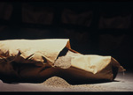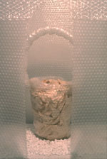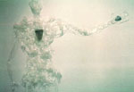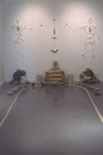 raw clay meets a "sticky clear" mylar tape skeletal figure who "stands" or rather sticks on dug clay and the wall. Clay shards in the heart and the hand are offered.